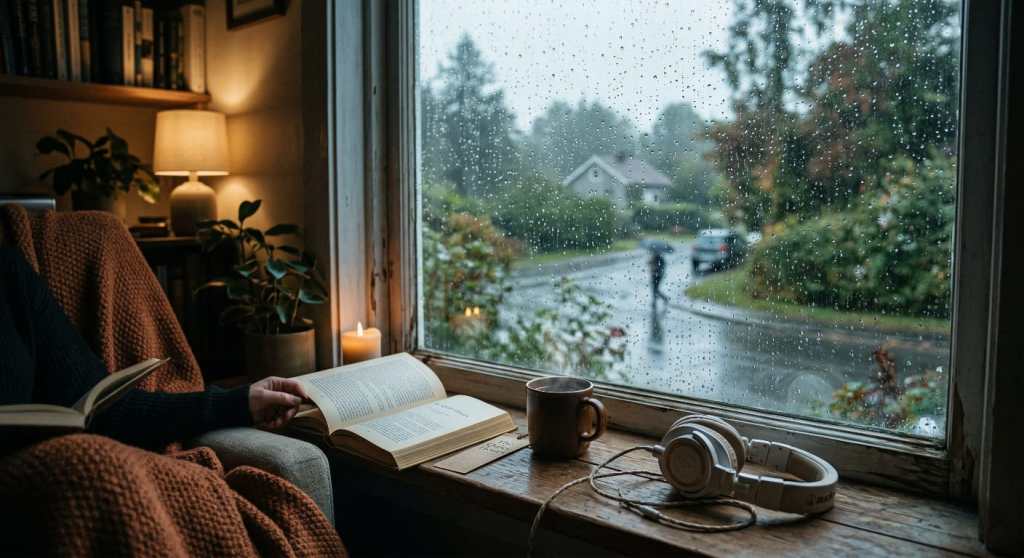 There’s also this unspoken coziness that rain carries with it. It’s not just about staying indoors, it’s about how everything feels a little closer, a little warmer, a little more intimate. The outside world blurs slightly, and your inner world becomes clearer. You don’t feel the need to chase anything for a while. You’re just there, with your thoughts, your feelings, your small comforts. A hot cup of coffee resting between your hands, the warmth slowly sinking into your skin. Soft lo-fi music playing in the background, not loud enough to distract you, just enough to hold you. And maybe a novel in your lap, pulling you into a different world while the real one quietly slows down outside your window.